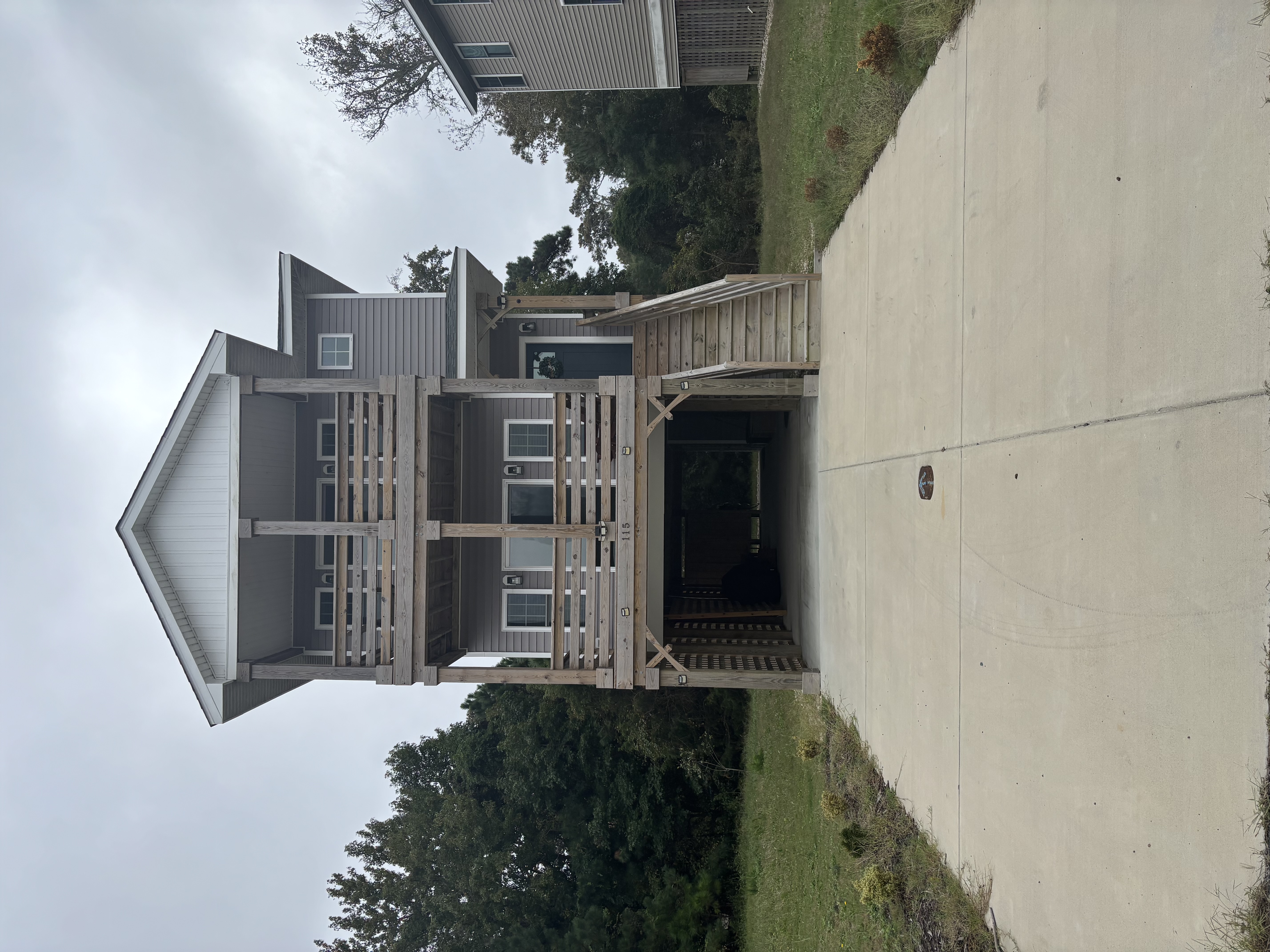 Located in Colington, this unfurnished home sits with a view of the nearby water from the decks.